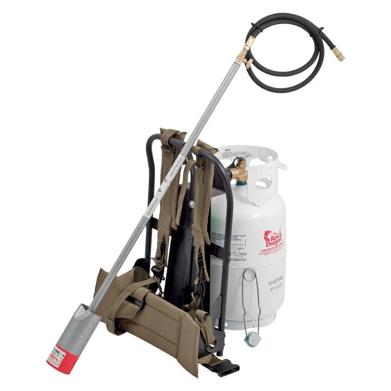 - Set-up includes a 400,000 BTU torch, 3 gallon fuel cylinder, 5′ hose and fittings, and backpack frame.