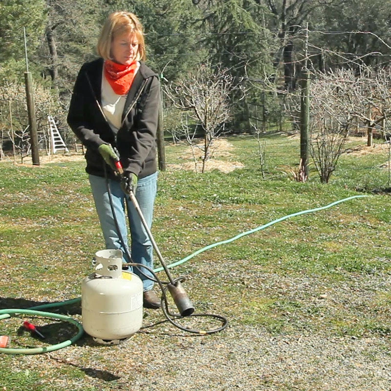 Note: avoid conifers and flammable residue such as pine needles, evergreen mulch, etc. Some weeds may need multiple flaming to completely kill.