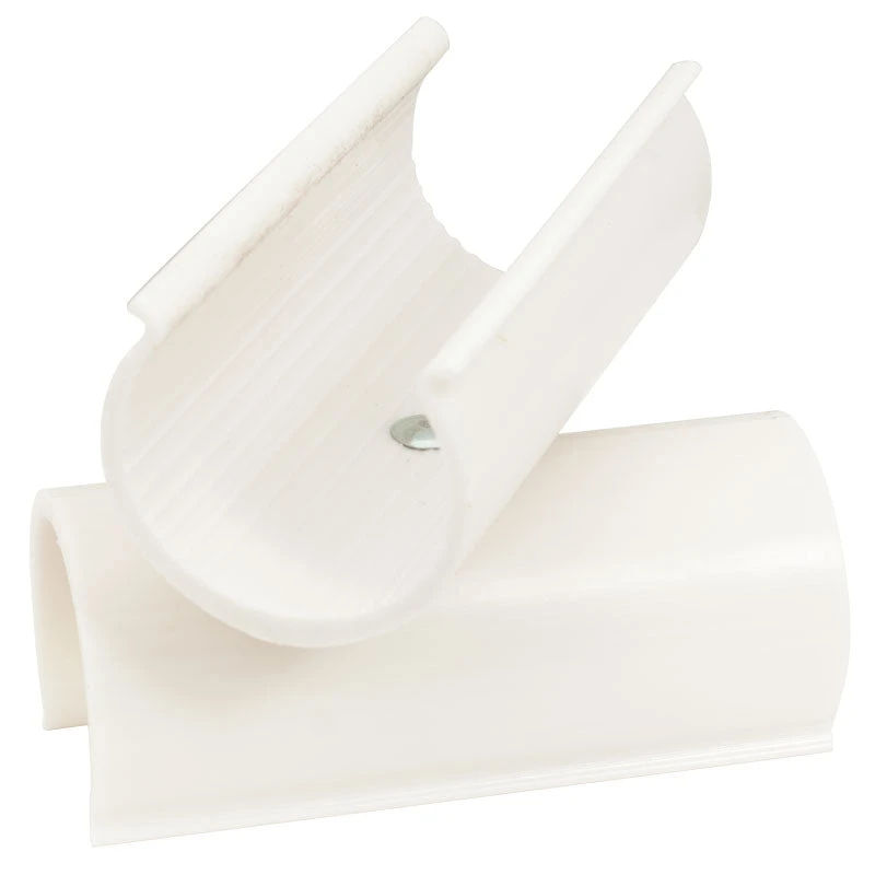 Two Rowcover Clamps attached to each other with a swivel. Clamp one side to your PVC rowcover hoops, and clamp the other side to your lengthwise PVC supports to keep the hoops stable and support the covering.